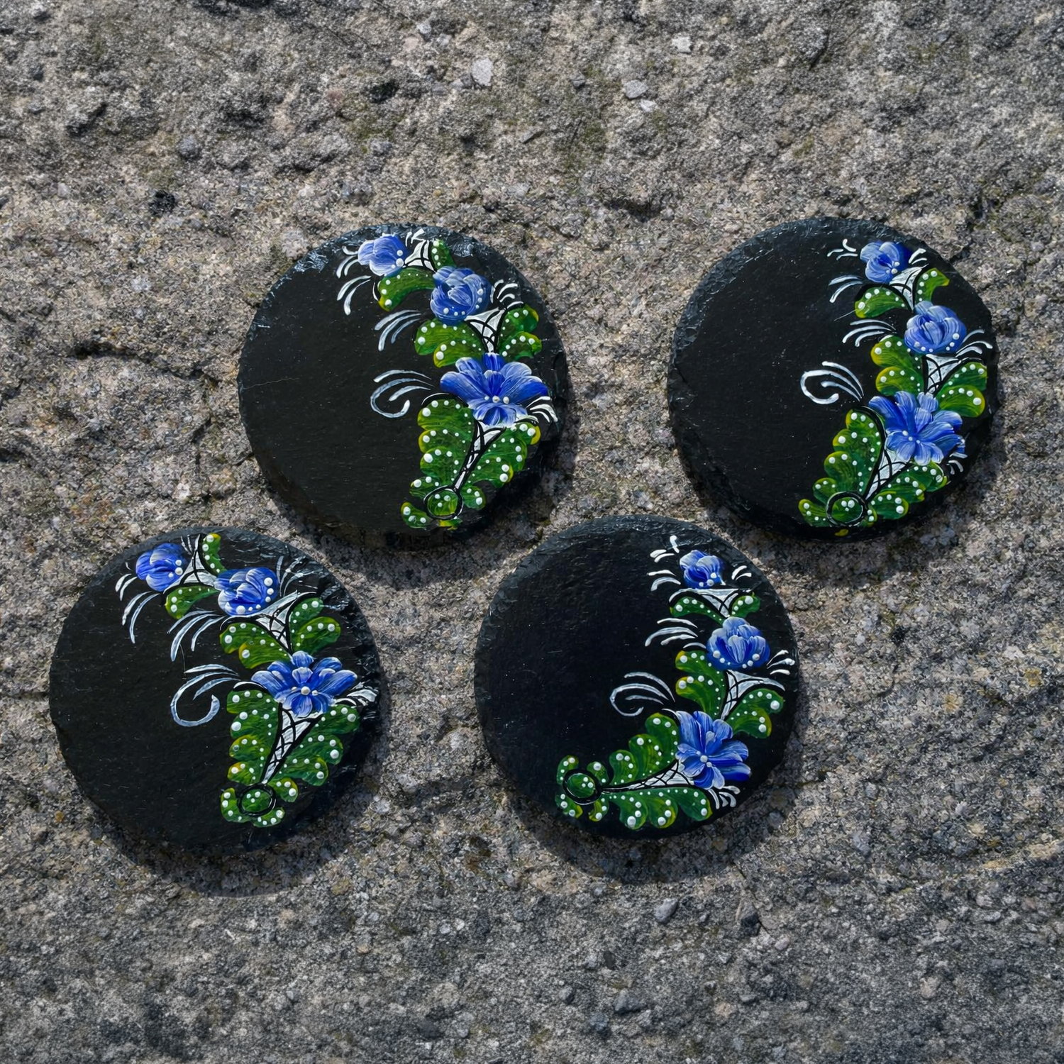 Fyra stycken svarta stenunderlägg med traditionell dalakurbits. Passar till hemmet eller som en personlig present. Välj själv vilken placering och färg du vill ha på kurbitsblommorna. Underläggen är ca 10 cm i diameter.